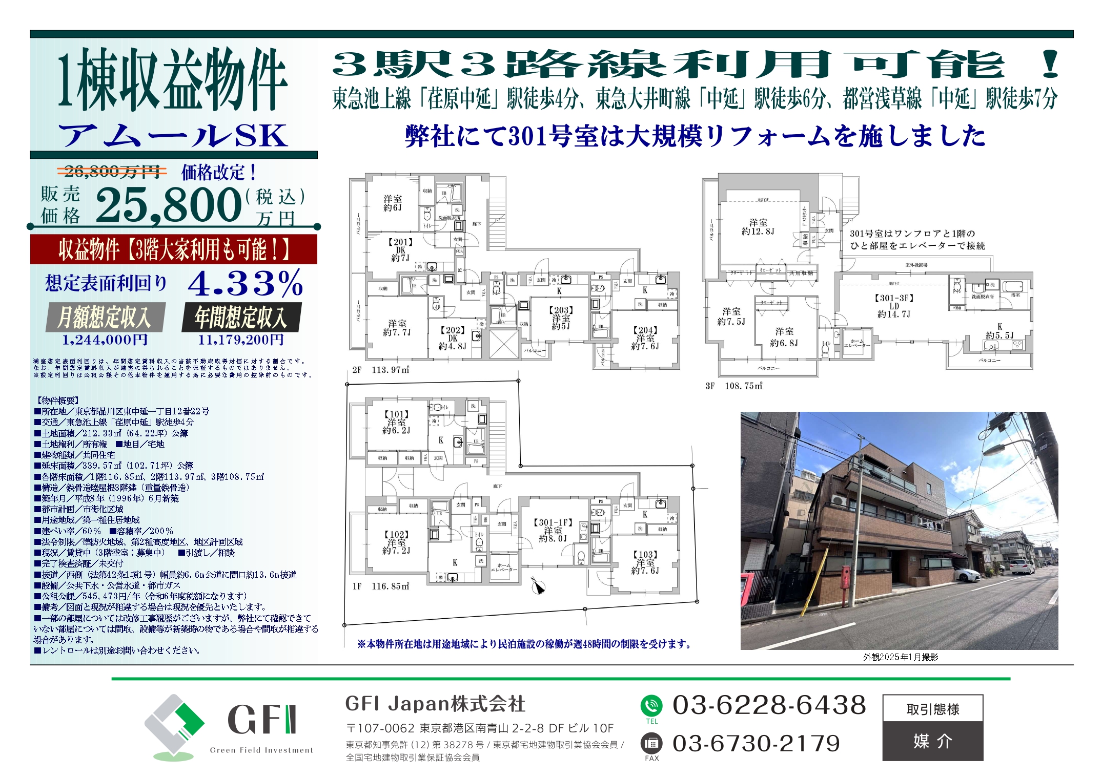 ・想定利回り4.33%、満室時年間賃料11,179,200円の安定収益